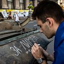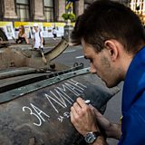 (Image: Sasha from Lyman, Donbas writes a slogan on a demolished Russian tank. Credit: Alex Chan Tsz Yuk/SOPA Images/LightRocket via Getty Images)