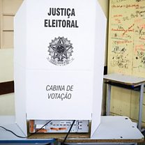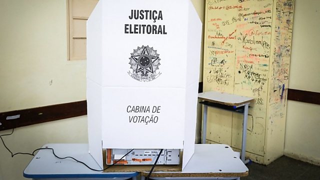 (Image: View of a voting room with the electronic ballot box in Brasilia, Brazil. Credit: SERGIO LIMA/AFP via Getty Images)