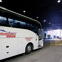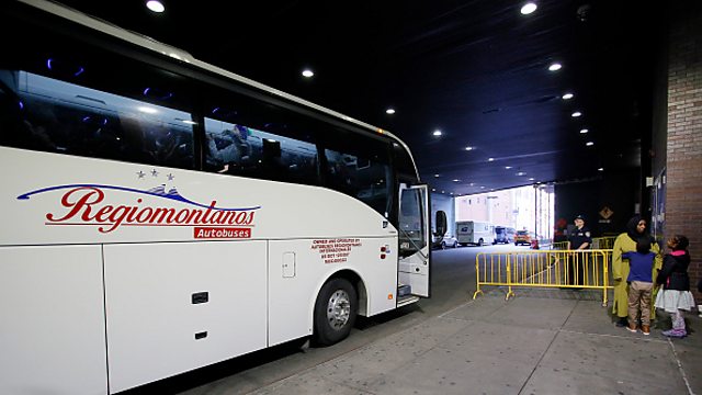 (Image: Migrants arrive on a bus from Texas to the Port Authority bus station in New York City. Credit: Leonardo Munoz/VIEWpress)