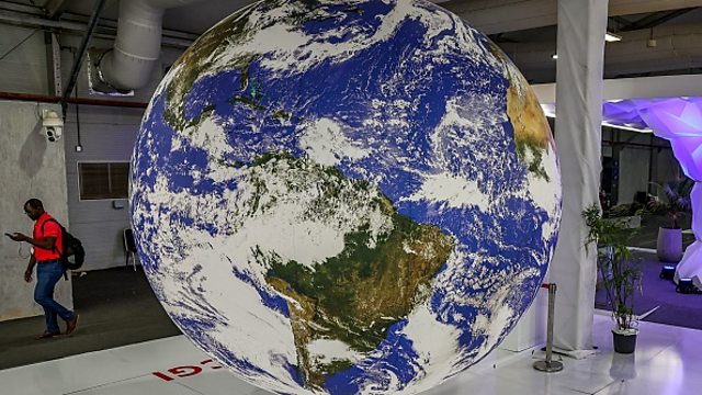 (Image: The Earth globe at a booth at the Sharm el-Sheikh International Convention Centre, Egypt. Credit: AHMAD GHARABLI/AFP via Getty Images)