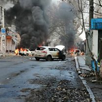 (Picture: Cars burning on a street following a shelling in Kherson, southern Ukraine. Credit: EPA/STATE EMERGENCY SERVICE OF UKRAINE)