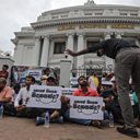 (Photo: A group of anti-government protesters stage a silent protest against the state independence day celebration in Colombo, Sri Lanka, on 3 February 2023. Placards in the Sinhala language read "Where is the Freedom?". Credit: Chamila Karunarathne/EPA)