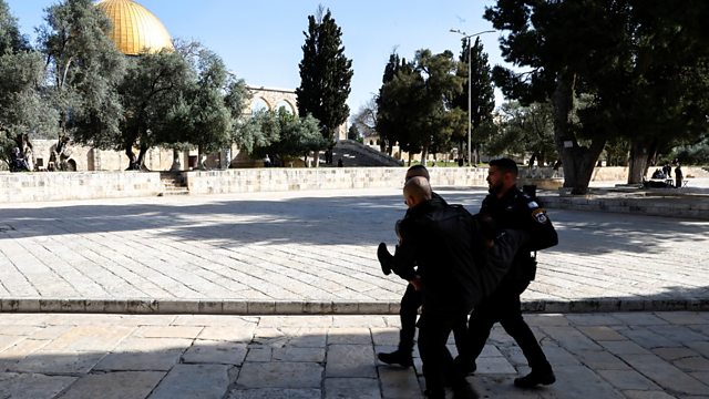 Israeli police and Palestinian worshippers clash at Al-Aqsa mosque in Jerusalem. Also in the programme: the Ukrainian grain glut that is affecting Poland’s farmers; and the exhibition featuring work by a jailed Russian anti-war artist.