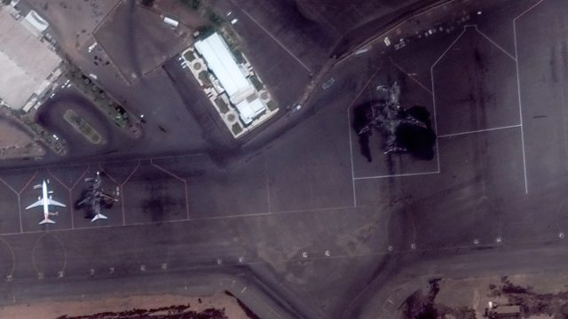 (Picture: Burnt-out passenger aircraft at Khartoum International Airport. Credit: Satellite image ©2023 Maxar Technologies)