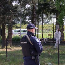 (A police officer guards as a Crime Scene Investigator looks for evidence at a crime scene site in the village of Dubona, near Mladenovac, Serbia. Credit: Andrej Cukic/EPA)