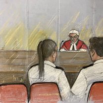 (Photo: Court artist drawing by Elizabeth Cook of Judge Mr Justice Goss addressing the dock containing two dock offices beside empty seats during the sentencing of nurse Lucy Letby at Manchester Crown Court. Credit: Elizabeth Cook/PA Wire)