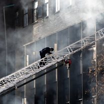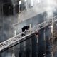 [MAGE: An emergency services member climbs a ladder at the site of a fire that broke out at a five-storey building in the city centre, in Johannesburg, South Africa, 31 August 2023 / CREDIT: EPA / KIM LUDBROOK]