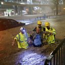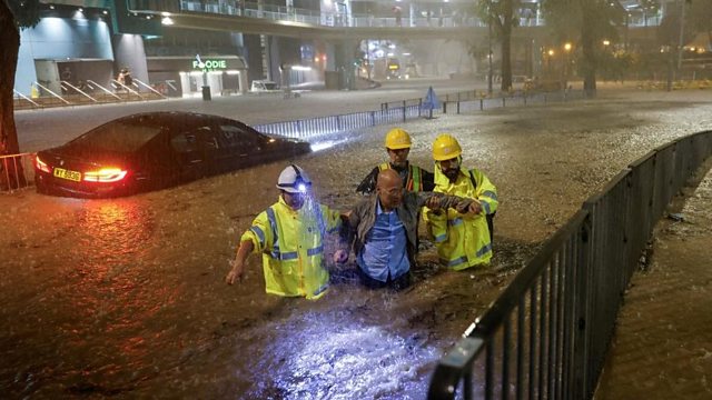(Photo shows drainage workers assisting a driver stranded due to flooding in Hong Kong. Credit: Reuters)