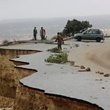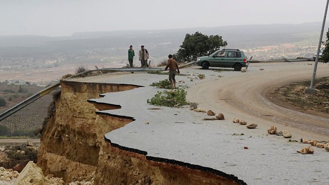 (Photo: People stand in a damaged road after a powerful storm and heavy rainfall hit Shahhat city, Libya, September 11, 2023. Credit: Reuters/Omar Jarhman)