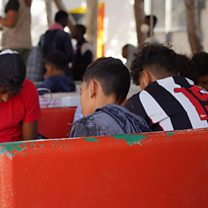 (IMAGE: On 26 September 2023 at the ‘hotspot’ reception centre for migrants on the island of Lampedusa, Italy, unaccompanied children and adolescents sit together while they wait to be transferred to other reception facilities. / CREDIT: UNICEF / Niccolò Corti)
