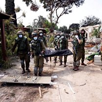(Photo: Israeli soldiers carry the body of a victim at Kfar Aza kibbutz. Credit: Reuters / Ronen Zvulun)