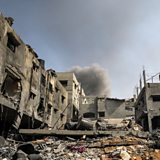 (Photo shows smoke rising behind destroyed buildings after an Israeli air strike in Gaza City on 23 October 2023. Credit: Mohammed Saber/EPA)