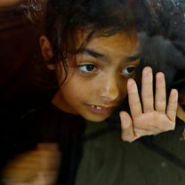 (Photo: A child looks through glass, as Palestinians with dual citizenship wait at the Rafah border crossing with Egypt, in the hopes of getting permission to leave Gaza. Credit: Reuters/Ibraheem Abu Mustafa)