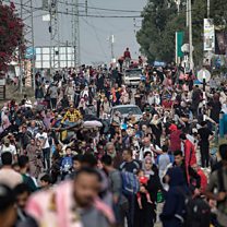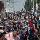 (Picture: Palestinians evacuating to the southern Gaza Strip, make their way along Salah al-Din Street. Credit: Haitham Imad/EPA-EFE/REX/Shutterstock)