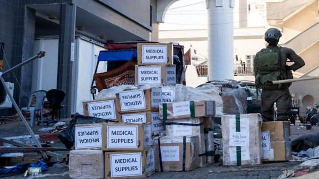 (Picture: An Israeli soldier pictured this morning beside boxes labelled "Medical Supplies" at the Al Shifa Hospital. Credit: Reuters)