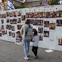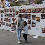 (Image: People look at an installation which shows the pictures of hostages in Tel Aviv, Israel, on 24 November 2023. Credit: Reuters/Zvulun )
