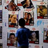 (Photo: A boy looks at placards as people wait for news of hostages to be released by Hamas. Credit: Reuters/Alexander Ermochenko)