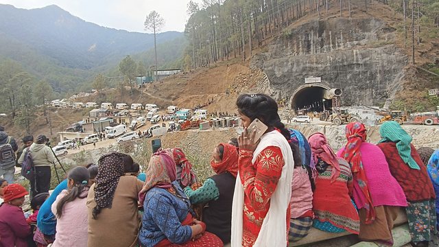 (IMAGE: Local villagers watch the site of a tunnel on the Brahmakal Yamunotri National Highway in Uttarkashi, India, 28 November 2023. 41 workers became trapped after an under-construction tunnel collapsed on 12 November 2023 / CREDIT: EPA / Abhyudaya Kotnala)