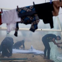 (Photo: People build a makeshift shelter in a new camp sheltering displaced Palestinians who fled their houses due to Israeli strikes. Credit: Reuters /Mohammed Salem)