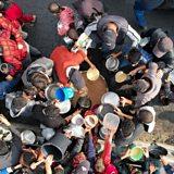 (Image: Palestinians gather to receive food cooked by a charity kitchen in Rafah in the southern Gaza Strip on 17 December 2023. Credit: Reuters/Tabatibi)