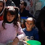 (Photo: Palestinian children wait to receive food cooked by a charity kitchen amid shortages of food supplies, in Rafah. Credit: Reuters)