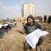 (Photo: Men carry bags of flour taken from an aid truck near an Israeli checkpoint in Gaza City last month. Credit: Getty Images)