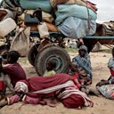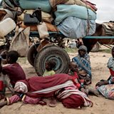 (Photo: A Sudanese family fleeing the conflict sits with their belongings at the border with Chad, Credit: Reuters, Z. Bensemra)