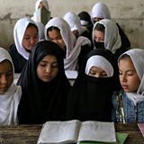 (Photo: Schoolgirls attending up to primary grade classes sit in a classroom at the start of the new academic year in Kabul, Afghanistan.