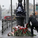 (Photo: A man lays flowers at a makeshift memorial for Russian military blogger Vladlen Tatarsky, who was killed in the April 02 bomb blast in a cafe, in St. Petersburg, Russia, 03 April 2023. Credit: ALTSEV/EPA-EFE/REX/Shutterstock)