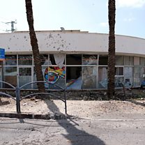 (Photo: A damaged building of a bank is seen following incoming rockets from Lebanon to Israel in Shlomi, northern Israel April 6, 2023. Credit: RS/Fadi Amun/Israel Out/ Reuters)