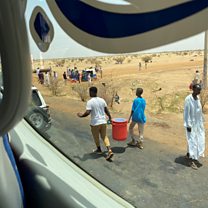 (Photo: People carry kerkade (hibiscus) juice and cold water to distribute them to people amid evacuations from Khartoum to Port Sudan. Credit: Twitter@dalliasd/via Reuters)