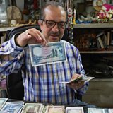 (Photo: Lebanese collector of banknotes and coins, Ahmad Raghdo displays an old Lebanese lira banknote inside his shop in Beirut, Lebanon May 8, 2023. Credit: Reuters/Mohamed Azakir)