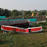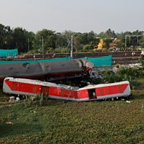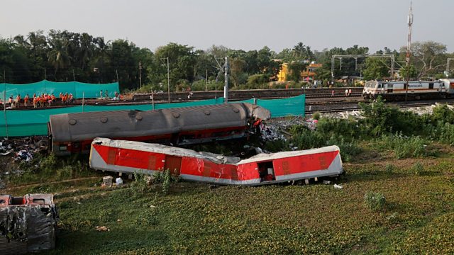 (Photo: A train moves past damaged coaches, after the tracks were restored, while the labourers work next to the tracks at the site of a train collision following the accident in Balasore district in the eastern state of Odisha, India, June 5, 2023. Credit: Adnan Abidi/Reuters)