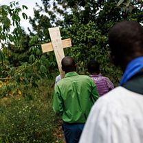 (PHOTO: A person carries a cross during the funeral of one of the victims of an attack at a school, in Mpondwe, Uganda, 18 June 2023. CREDIT: EPA/LUKE DRAY)