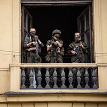 (Photo: Members of Wagner group stand on the balcony of the circus building in the city of Rostov-on-Don, on June 24, 2023.Credit: ROMAN ROMOKHOV/AFP/Getty Images)