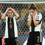 (Photo: Svenja Huth and Chantal Hagel (R) of Germany react following the FIFA Women's World Cup 2023 soccer match between South Korea and Germany at Brisbane Stadium in Brisbane, Australia, 03 August 2023. Germany did not qualifiy for the knockout stage. Credit: DARREN ENGLAND/EPA-EFE/REX/Shutterstock)