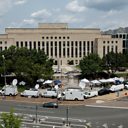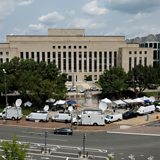 (Photo: News trucks fill the sidewalk in front of the federal courthouse where former U.S. President and Republican presidential candidate Donald Trump is expected to answer charges after a grand jury returned an indictment of Trump in the special counsel's investigation of efforts to overturn his 2020 election defeat In Washington, U.S. August 2, 2023. Credit: Jonathan Ernst/Reuters)