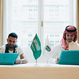(Photo:Al-Ahli's new signing Riyad Mahrez and Al-Ahli executive director Yazin Al-Sharif are pictured signing contracts. Credit: Al-Ahli Club Media Office/Handout via REUTERS)