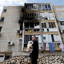 Picture: Reuters. A man holds his dog after a rocket, launched from the Gaza Strip, landed in Ashkelon 11/10/2023