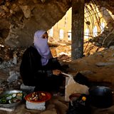 (Photo: A woman cooks in a destroyed mosque, amid shortages of food supplies and fuel, as the conflict between Israel and Palestinian Islamist group Hamas continues, in Khan Younis in the southern Gaza Strip November 17, 2023. Credit: Ibraheem Abu Mustafa/Reuters)