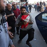 (Photo: A man holds a baby as wounded Palestinians are rushed into Nasser hospital following Israeli strikes, amid the ongoing conflict between Israel and the Palestinian Islamist group Hamas, in Khan Younis in the southern Gaza Strip, December 4, 2023. Credit: Ibraheem Abu Mustafa/Reuters)