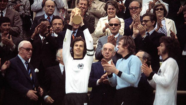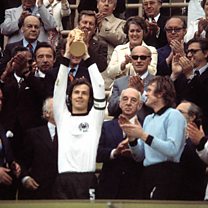 (Photo: 1974 FIFA World Cup in Germany final in Munich: Germany 2 - 1 Netherlands - Captain Franz Beckenbauer raising the trophy at the award ceremony. Credit: Sepp Maier, Paul Breitner/Getty Images)