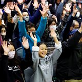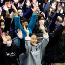 (Photo: People raise their hands after a successful moon landing by the Smart Lander for Investigating Moon (SLIM), in a public viewing event in Sagamihara, south of Tokyo, Japan January 20, 2024. Credit: Kim Kyung-Hoon/Reuters)