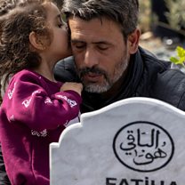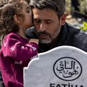 (Picture: A girl kisses her father as they visit a cemetery for people killed by last year's earthquake, in Hatay, Feb 2024 Credit: Reuters/Umit Bektas)
