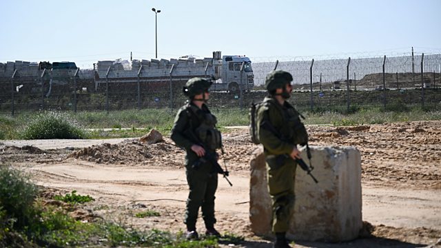 (Photo: Trucks carrying aid line up near the border of Gaza, Kerem Shalom crossing, Israel, February 7, 2024. Credit: REUTERS/Dylan Martinez)