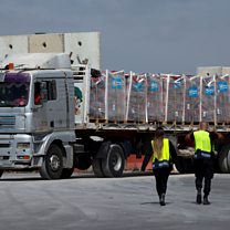 (Photo: A truck carrying humanitarian aid bound for the Gaza Strip. Credit: Reuters/Carlos Garcia Rawlins)