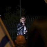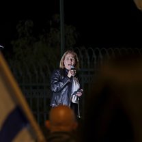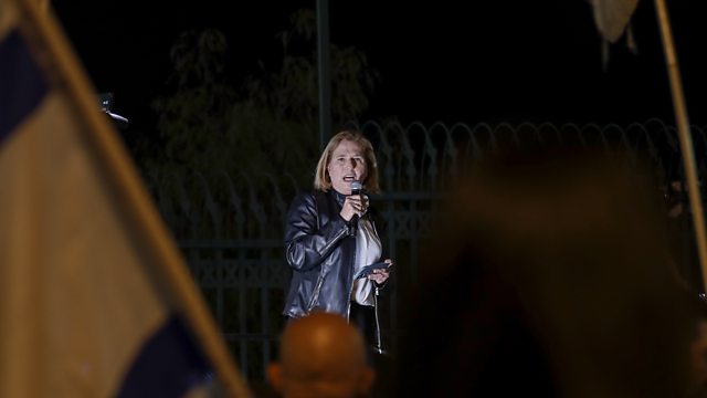 (Photo: Tzipi Livni, former Israeli minister of foreign affairs, speaks to protesters of reserve soldiers in the Israeli army during the anti-government protest next to the Israeli Prime Minister's office (background) in Jerusalem on 2 March 2023. Credit: EPA/Atef Safadi)