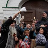 (Photo: A priest of the Ukrainian Orthodox Church, accused of being linked to Moscow, sprays holy water on believers while they pray and block an entrance to a church at a compound of the Kyiv Pechersk Lavra monastery, amid Russia's attack on Ukraine, in Kyiv, Ukraine March 31, 2023. REUTERS/Valentyn Ogirenko)