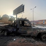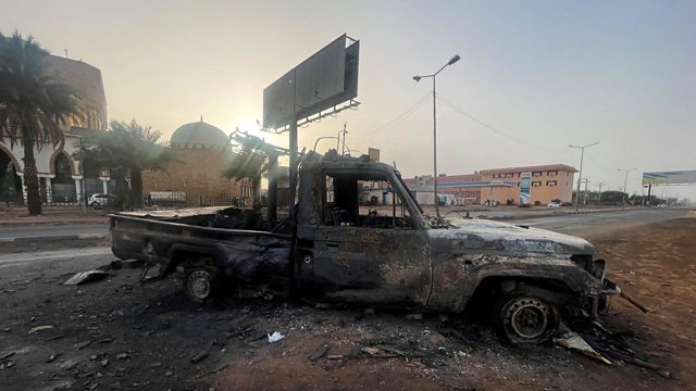 (IMAGE: A burned vehicle is seen in Khartoum, Sudan April 26, 2023. CREDIT: REUTERS/El-Tayeb Siddig/File Photo)