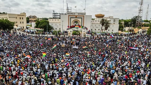 (Photo: Thousands of anti-sanctions protestors gather in support of the putschist soldiers in the capital Niamey, Niger on 3 August 2023. Credit: Reuters/Mahamadou Hamidou)